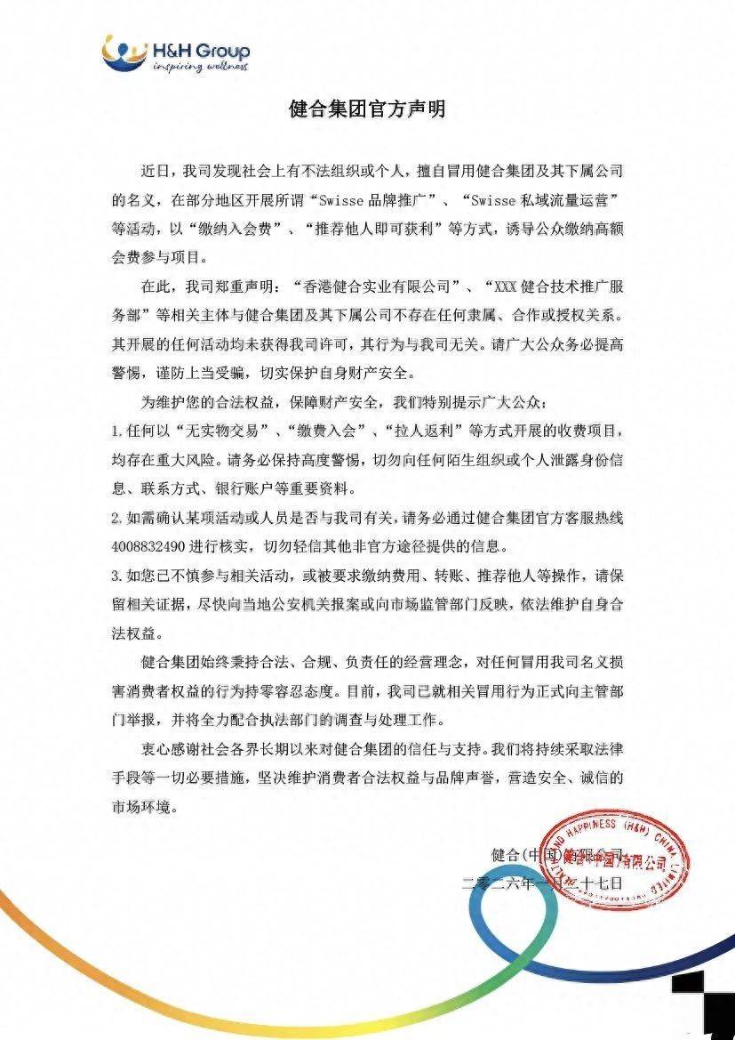 新京报讯(首席记者郭铁)1月27日,港股上市养分品公司健书册团发布声明称,公司发现存作恶组织或个东说念主,私行冒用健书册团十分下属公司的风物,在部分地区开展所谓“Swisse品牌本质”、“Swisse私域流量运营”等动作,以“交纳入会费”、“保举他东说念主即可赢利”等方式开云kaiyun,带领公众交纳高额会费参与样式。