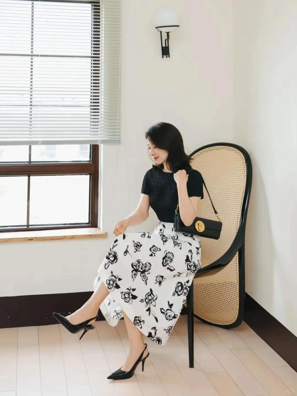 更毛糙的相识,像底下这一条长短印花的伞状半身裙,这条半身裙显得相配的大气,天然亦然印花的贪图,然而项目从简,搭配上玄色的竭诚短袖上衣,和一对玄色的高跟鞋,轻狂放松穿出优雅感。