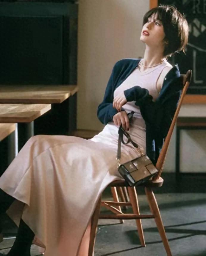 我们要穿尽量聘用纯色系的裙子,举例底下这位达东谈主的穿搭,藏蓝色的竭诚开衫搭配上,浅粉色的半身裙和同色系的竭诚背心,这闲隙穿衣打扮就显得终点高档。