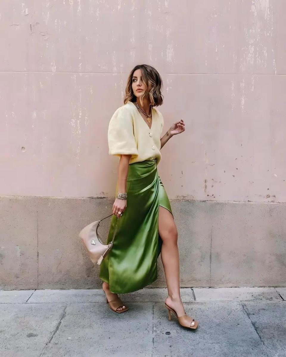 普通巨匠女性穿衣配色尽量不要过于夸张,举例底下这一件灯笼袖的V领上衣贪图过于蓬松,加上荧光绿的开叉半身裙,这么的色调搭配,其实普通巨匠女性的很难把握的住,除非你有高挑纤瘦的体魄比例,要否则也无法穿出以下这种气场来。