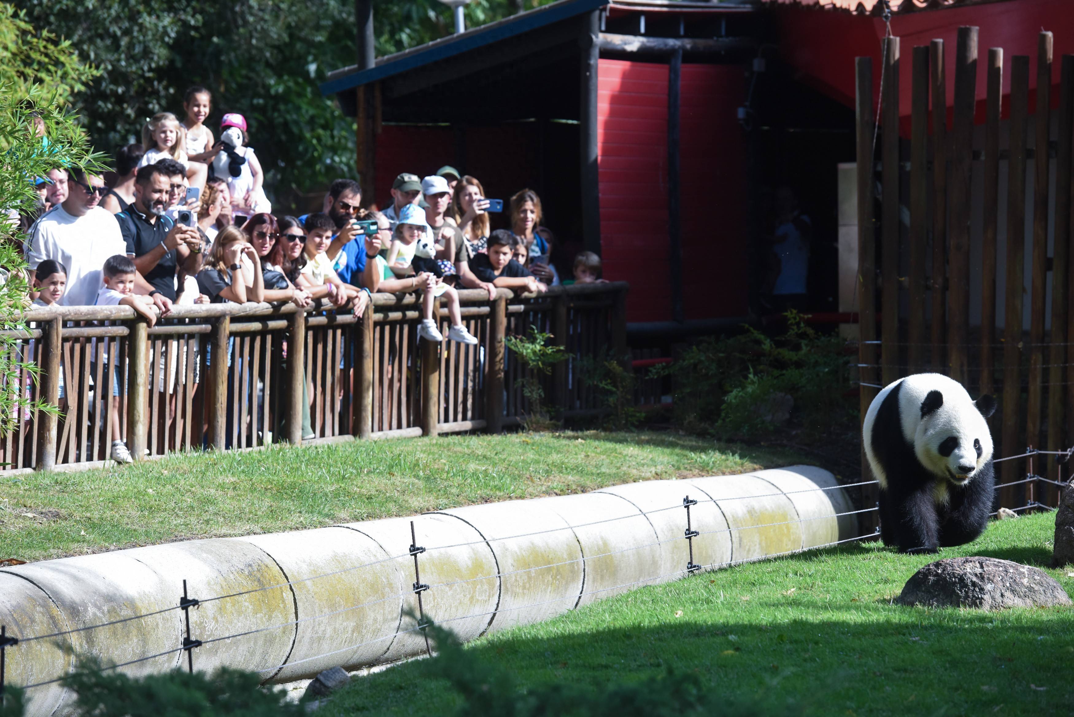 9月20日,在西班牙马德里动物园,旅客们与大熊猫“金喜”互动。新华社发 古斯塔沃·巴连特 摄