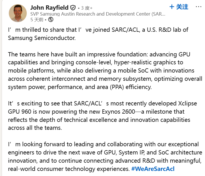 四肢最新案例,三星在官宣Exynos 2600同期,还晓喻挖来了配结伴伴AMD的计较与图形事迹部的副总裁约翰·雷菲尔德,附近三星的奥斯汀商议中心(SARC)和先进计较实践室(ACL),推动Exynos GPU有关的研发。
